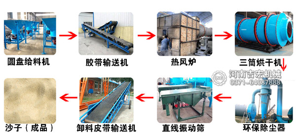 石英砂先經過圓盤給料機被均勻地送入到皮帶輸送機之上,之后通過流沙管進入到烘干機內部,熱風爐內燃料的燃燒產生的熱量在抽風機的作用下進入到主機內與沙子進行接觸,完成熱量的傳遞,快速蒸發(fā)水分。我公司生產的沙子烘干機是三回程密封結構,能夠很好的降低熱量的散失,提高熱效率。干燥之后的沙子輸送到直線振動篩進行篩分,之后被提升機送入儲料罐進行儲存或者進行打包裝袋。在接料斗的上部是排放工藝流程之中的塵土等,經過除塵系統(tǒng)處理之后,能夠很好的達到環(huán)保的目的。