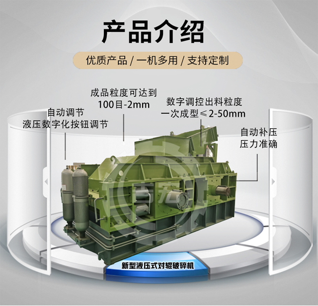 對輥式破碎機將破碎物料經給料口落入兩輥子之間,進行擠壓破碎,成品物料自然落下。遇有過硬或不可破碎物時,對輥式破碎機的輥子可憑液壓缸或彈簧的作用自動退讓,使輥子間隙增大,過硬或不可破碎物落下,從而保護機器不受損壞。相向轉動的兩輥子有一定的間隙,改變間隙,即可控制產品最大排料粒度。